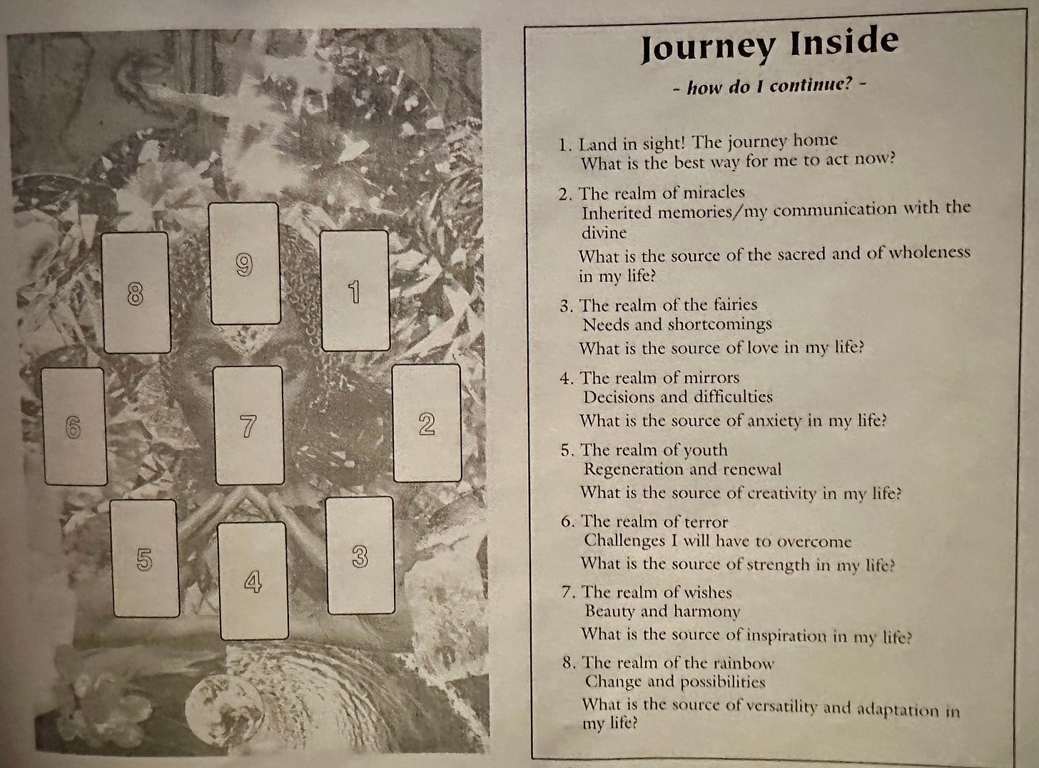 I asked my guides for a spread that would help explore these themes. This is what they advised, using The Moon as our guide. I was directed to a book I have owned for probably 15 years, but do not consult often, “Illustrated Tarot Spreads: 78 New Layouts for Personal Discovery” by Heidemarie Pielmeier & Marcus Schirner. I found a spread that fit what was in my mind, with minimal changes, “The Journey Inside”.