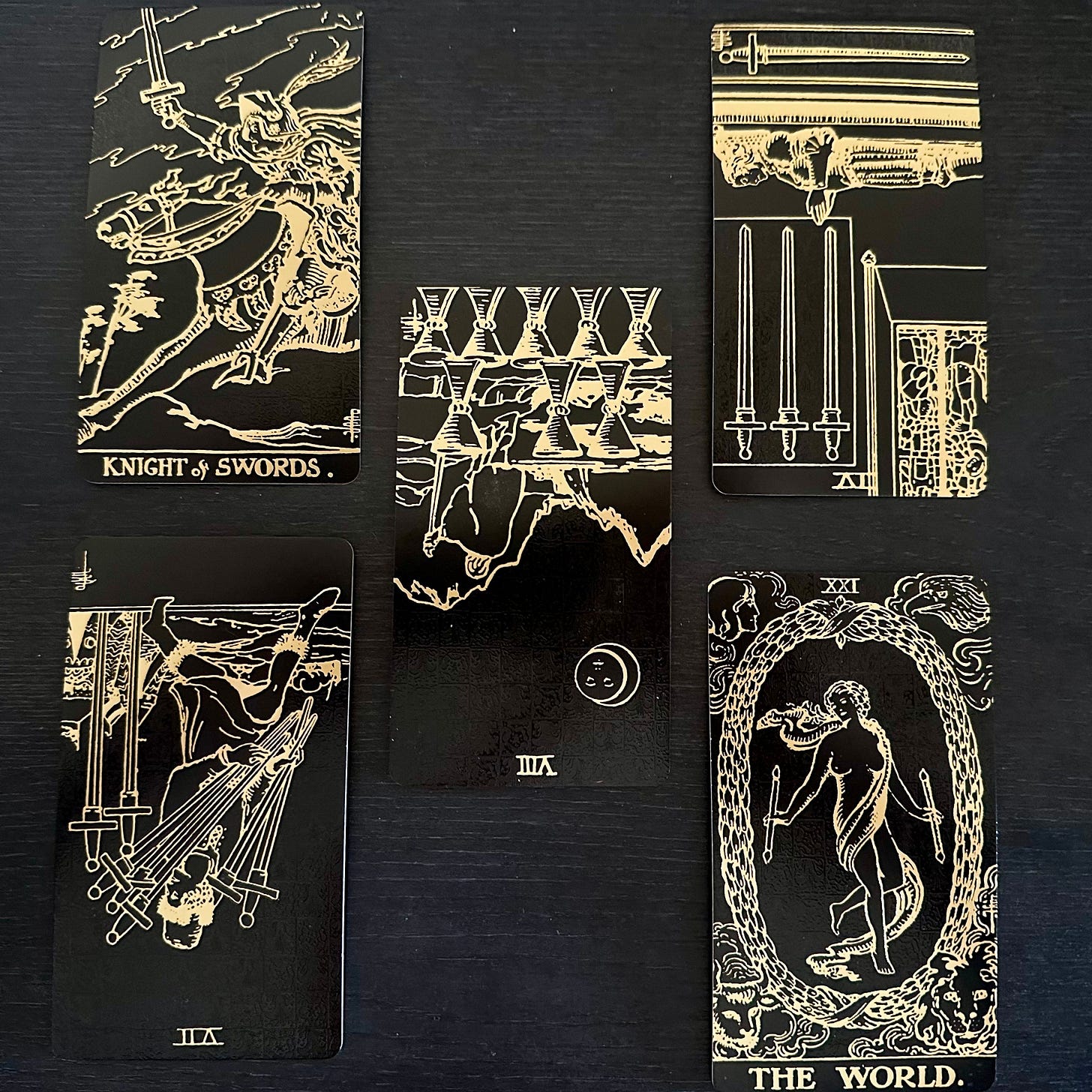 Here’s the cards as they laid out, from this lovely gold and black deck: