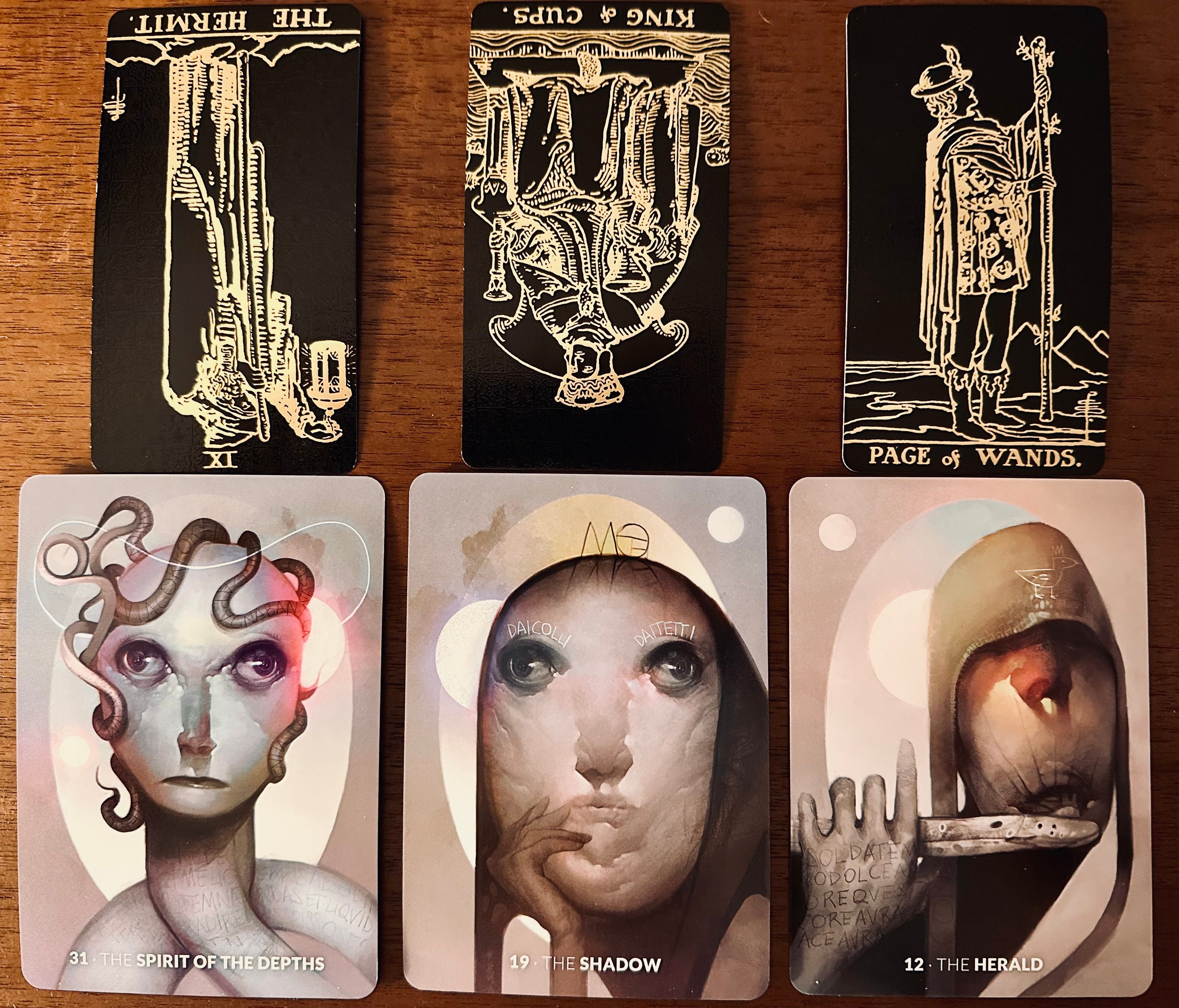 “[The Herald is] the prime motive for every change, it transforms the Soul, who accepts the adventure with fear and hope, the journey and the descent into the underworld, between the lakes of the ice and sulfur, into the horrid, deep belly of the mysterious monster. As the eternal child, Hermes the messenger, he flies and swiftly breaks through the subtle limits of the worlds: his is a siren song, calling to the soul that listens. Vocal prodigy, in the circular, changeless world, he reveals to the dormant soul the luminous paths of no return.” (Jungian Archetype Oracle guidebook, p. 22)